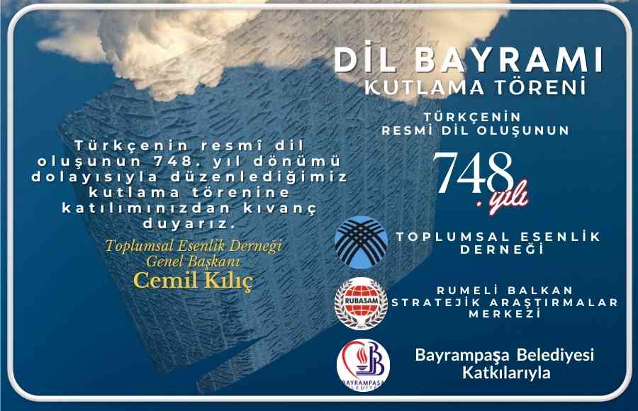 13 Mayıs Salı günü saat 19.00’da Bayrampaşa Mehmet Akif Ersoy Kültür Merkezinde gerçekleştirilecek törende, Türkçenin yönetim dili oluşunun 748. yılı kutlanacak. Etkinlikte Türk dilinin tarihsel serüveni, bugünü ve geleceği üzerine çarpıcı konuşmalar yapılacak.